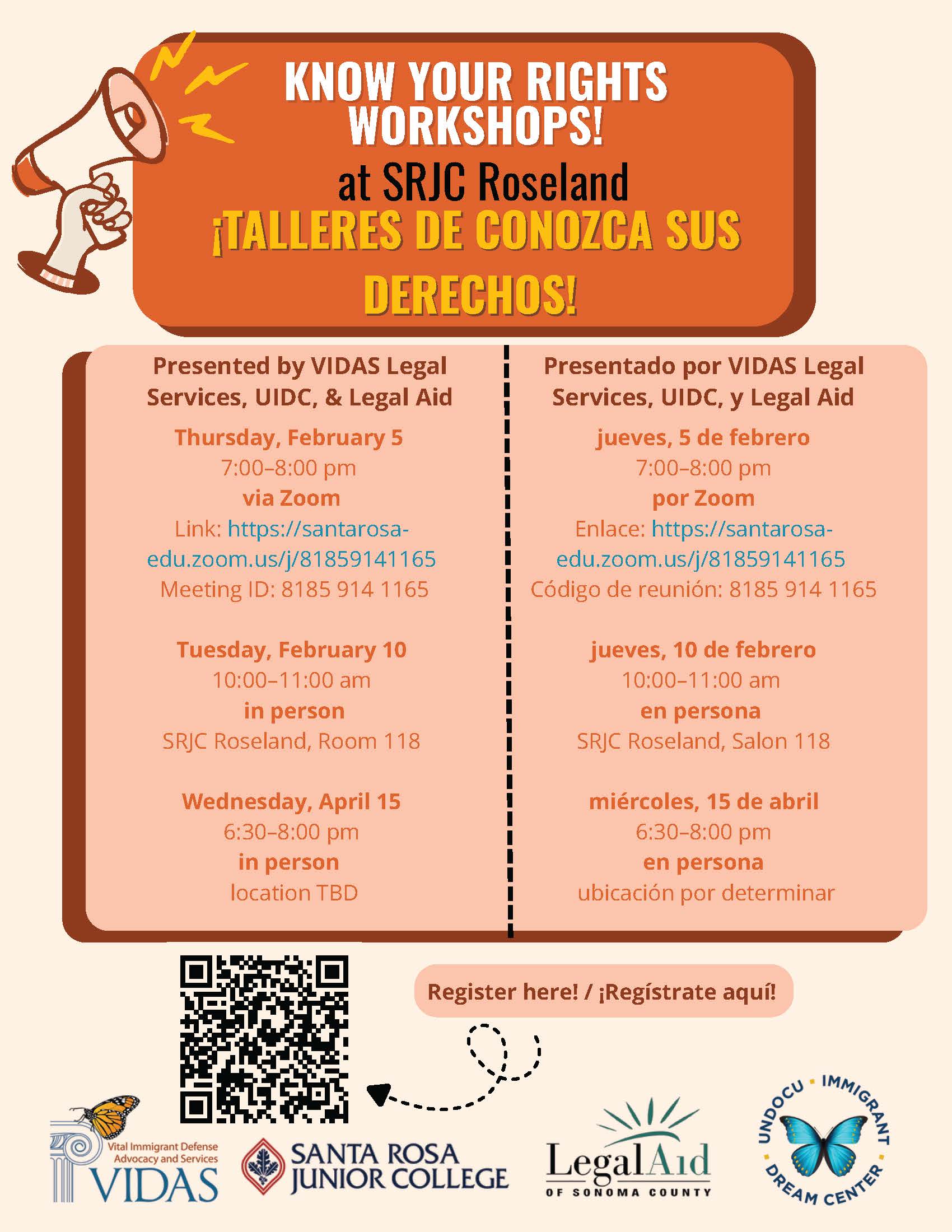 - jueves, 10 de febrero de 10:00–11:00 am en persona SRJC Roseland, Salon 118