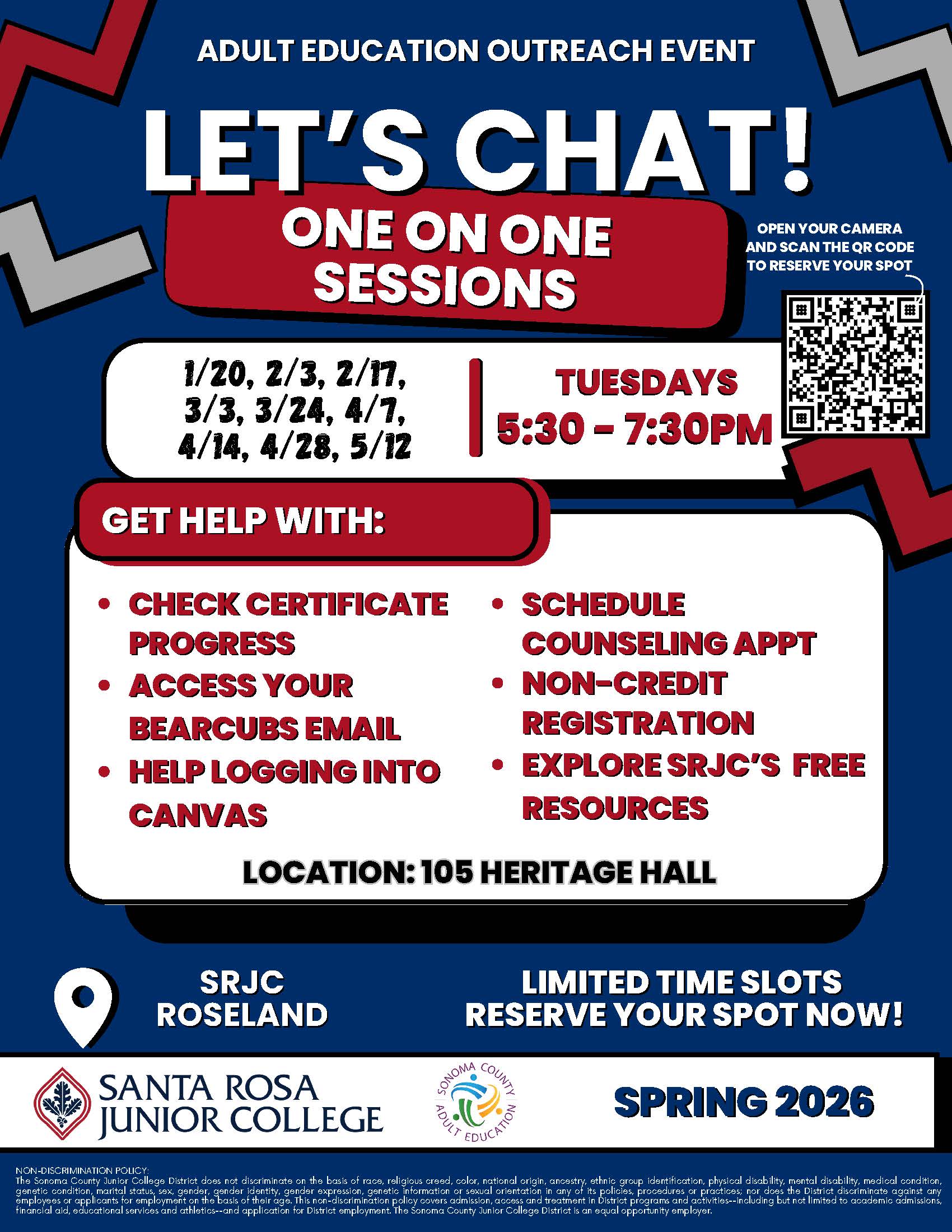 - Tuesday, February 10 from 10:00–11:00 am in person SRJC Roseland, Room 118